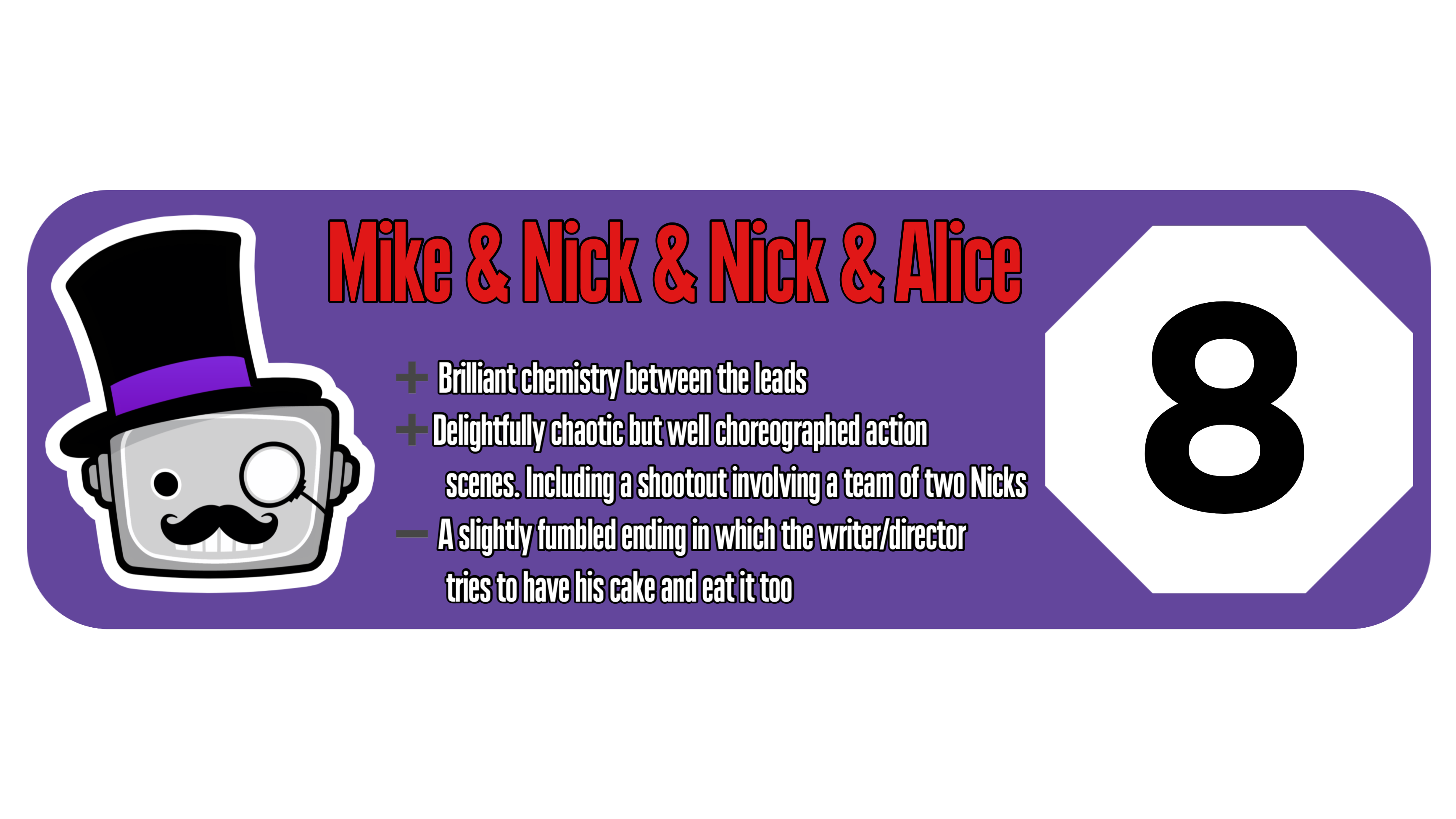 Apart from a slightly fumbled ending, Mike & Nick & Nick & Alice is a hilarious and delightfully chaotic blend of genres. Making it hard not to laugh as these underworld heroes urgently attempt to change their fate.